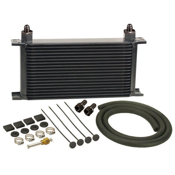 With Derale's top of the line 19 Row Stack Plate cooler, -6AN aluminum fittings and hose barb adapters, this highly efficient kit extends transmission life by preventing heat-related transmission failures. It also improves shifting performance. The 19 Row High Performance Transmission Oil Cooler kit comes with a complete transmission cooler hardware kit which allows you to easily install it onto vehicles with 5/16" transmission cooler lines.