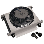 Equipped with Derale's top-of-the-line 25-row stack plate cooler, the Hyper-Cool remote fluid cooler can literally be mounted almost anywhere, making it a popular addition for serious performance cars, hot rods, muscle cars and trucks. With an all-aluminum, oven-brazed Stack Plate cooler coupled with a Tornado fan and aluminum shroud, it comes with aluminum -10AN male fittings and -10AN x 1/2" barb adapters to provide serious cooling in a small package. This cooler was designed primarily for engine oil applications, but also can be used for heavy-duty transmission or fuel cooling. The Hyper-Cool is perfect for extreme duty applications.