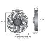 A 14" Diameter version of Derale's high performance H.O. Extreme series of electric fans, this powerful unit uses 10 thin, curved blades to provide a low profile (only 3 7/16" at widest point) for limited space applications. Using a sealed IP68 certified waterproof & dustproof motor that lasts up to 3 times longer than normal electric fan motors, this puller fan is designed to provide maximum performance at high static pressure loads. Mounting kit and installation instructions included.