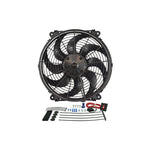 The extremely popular Derale 14” reversible Tornado fan uses 8 skewed blades and its quiet, high torque electric motor produces a healthy 1350 CFM at 0 static pressure while drawing only 10.5 amps. Fan kit includes everything you will need for a manual switch installation.