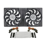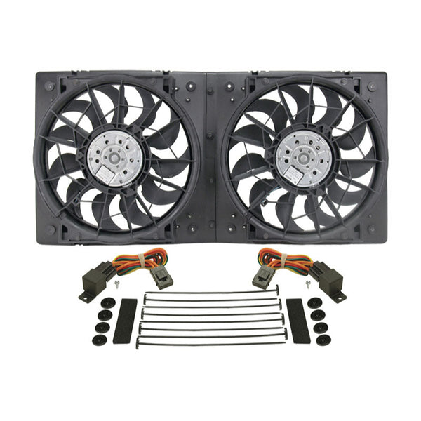 Derale high performance primary cooling fan kit combines two high output 265 watt Bosch motors with stator flow directors and an OE-quality injection moulded fan shroud to produce one serious dual electric fan set-up. Designed for puller applications, it’s perfect for muscle cars, street rods and heavy duty trucks, producing 4000 CFM while each fan draws 24.8 amps. Includes through radiator mounting system and two high amp relay harnesses.