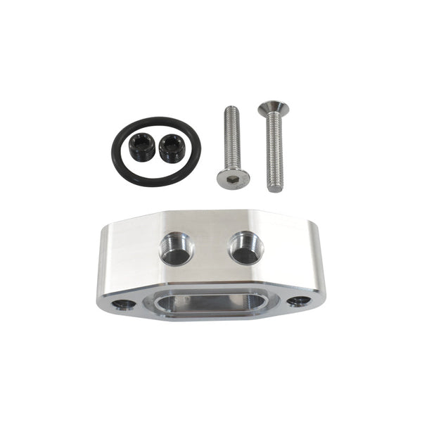 - Billet aluminium CNC-machined LS Oil Port Adaptor has Two (2) x 1/8 NPT threaded ports for oil pressure gauge, turbo feedlines and One (1) x M16-1.5 Port to relocate the factory oil pressure sensor.