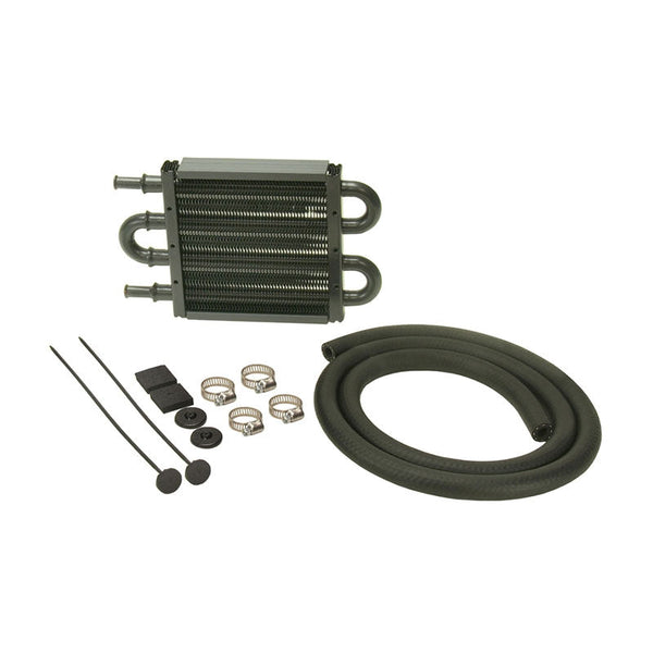 This four-pass tube and fin power steering cooler uses ½” copper tubing expanded into aluminium cooling fins to extend pump and seal life and improve steering performance. Features 11/32” hose barb inlets.