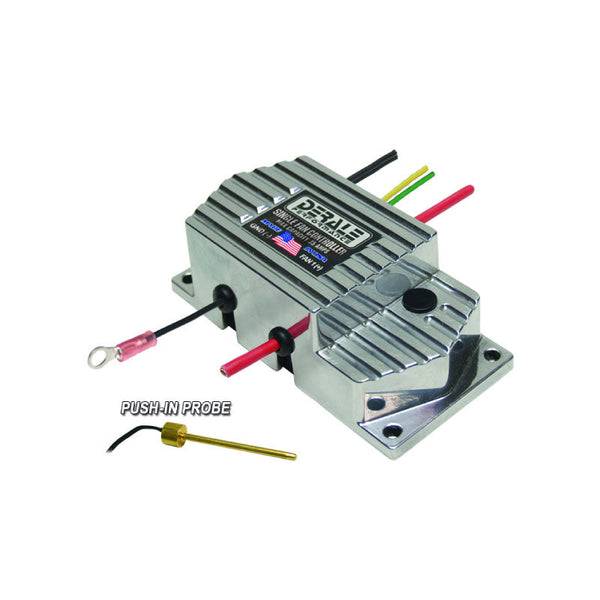 Designed with quality and performance in mind, this High Amperage Fan Controller breaks new ground in the industry of electric fan controllers. 100% USA made, a bulletproof design, 35 amp rating, adjustability from 150°-240°F, and a die cast bright finish aluminum cap, come together to make this fan controller stand out from the crowd. The electric fan is activated at the temperature set by the user, and turn off is preset at 10°F below the desired turn-on temperature. Kit comes complete with wiring harness, fusible link, all necessary electrical connectors and push-in style radiator probe.