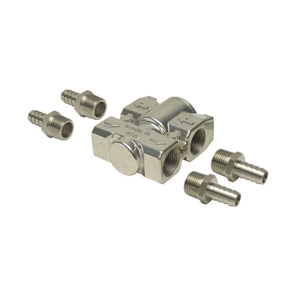 This Billet Style Cast Aluminum Fluid Control Thermostat with 1/2" NPT ports allows the oil to bypass the cooler until it reaches 180°F at which point the internal thermostatic valve will close and force 100% of the oil through the cooler while maintaining a constant pressure system. This process allows the engine/transmission to achieve the ideal operating temperature quicker before passing the oil through the cooler. The unit can be rotated 180° to change flow direction. Hardware kit with hose barb fittings and hose clamps included.