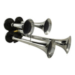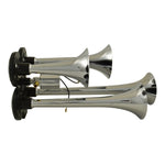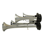 Features unique and distinctive twin long metal chrome plated trumpets (not plastic) Trumpets measure 37cm and 32cm long Includes an extra strong and powerful 12V compressor allowing either an alternating...