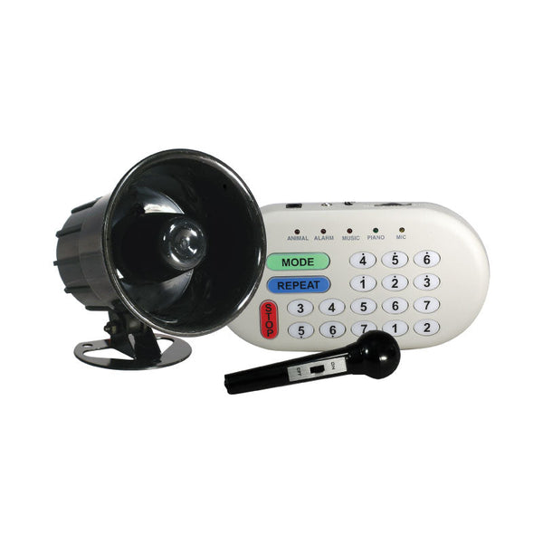 Galaxy Horn with 46 different animal sounds, sirens and songs. The Galaxy Horn comes with a microphone and can also be used as a powerful public address system.