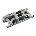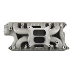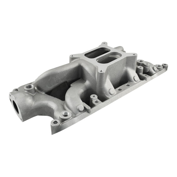 To create the manifold we took our Typhoon manifold for Small Block Fords and modified it to produce an open area under the plenum (commonly called an air gap). This then became our Crosswind model. This design allows ambient air to pass beneath the plenum which has a cooling effect on the incoming fuel/air charge thus producing more power. This isolation also keeps engine heat from transferring into the plenum chamber. This manifold has several unique features such as a rear water crossover passage which contributes to cooler running engine, nitrous bosses and 4 corner water ports.