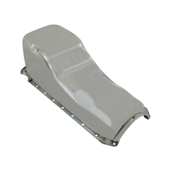 Steel factory replacement style oil pan to suit 1955-1979 Small Block Chevrolet engines 305, 307, 327, 350, 400 cubic inch with 2 piece rear main seal, passenger side dipstick. 4...