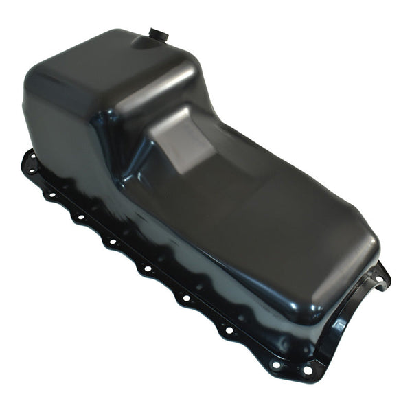 Steel factory replacement style oil pan to suit 1955-1979 Small Block Chevrolet engines 305, 307, 327, 350, 400 cubic inch with 2 piece rear main seal, passenger side dipstick. 4...
