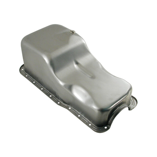 Steel factory replacement style oil pan to suit 1955-1979 Small Block Chevrolet engines 305, 307, 327, 350, 400 cubic inch with 2 piece rear main seal, passenger side dipstick. 4...