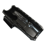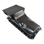 Steel factory replacement style oil pan to suit 1955-1979 Small Block Chevrolet engines 305, 307, 327, 350, 400 cubic inch with 2 piece rear main seal, passenger side dipstick. 4...