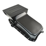 Steel factory replacement style oil pan to suit 1955-1979 Small Block Chevrolet engines 305, 307, 327, 350, 400 cubic inch with 2 piece rear main seal, passenger side dipstick. 4...