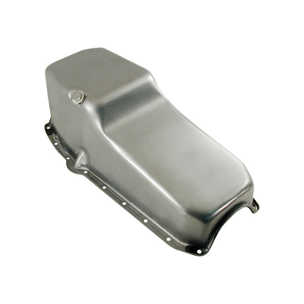 • Steel factory replacement style oil pan to suit 1955-1979 Small Block Chevrolet engines 305, 307, 327, 350, 400 cubic inch with 2 piece rear main seal, passenger side dipstick.