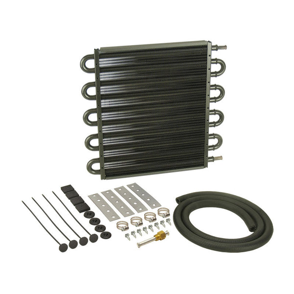 This Tube & Fin Transmission Cooler features ½” copper tubing expanded into aluminium cooling fins and includes embossed turbulators which serve to agitate fluid for maximum heat transfer. Perfect for full size cars and medium size trucks and SUVs that are used for part time towing, they improve shifting performance and extend the life of the transmission by eliminating heat related transmission failures. This kit comes with a complete transmission/trans cooler hardware kit to easily install onto vehicles with 5/16” transmission cooler lines.