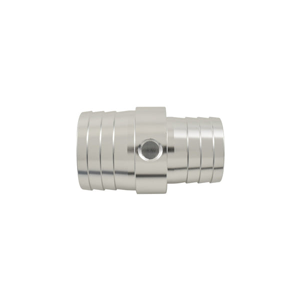 • This fitting has a 1-1/4” Barb and a 1-1/2” barb with a hose stop flange to keep the coupler centred in the splice connection.